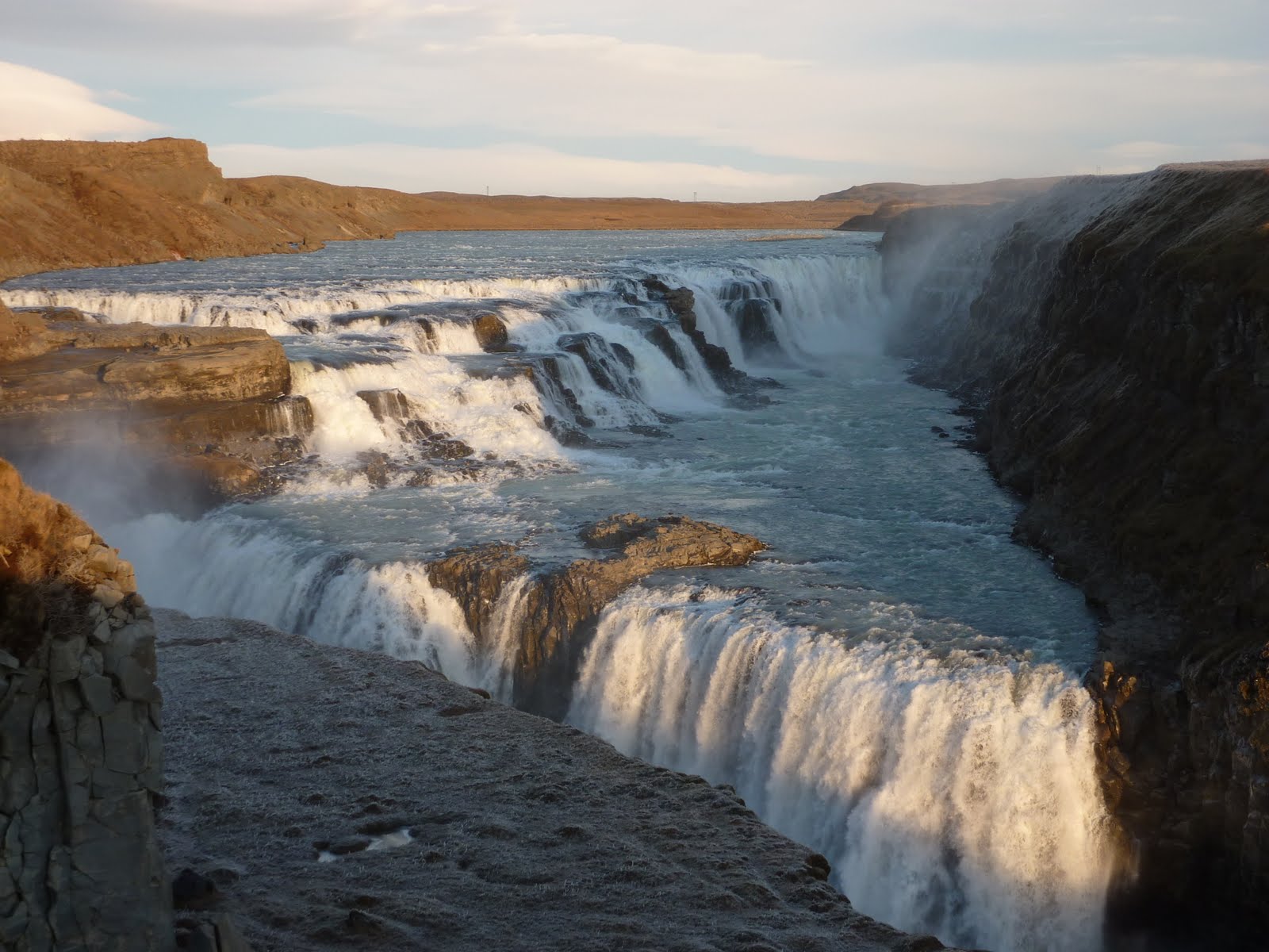 Next up was the Gullfoss waterfall, however before we got there we were treated to the rare sight of an arctic fox on the side of the road. The arctic fox is a shy creature that looks a bit like a fluffy cat and it is Iceland's only native mammal. Gullfoss was a little more impressive than the ball of fluff. It is a monster waterfall in two tiers at right angles to each other (see photo below). The total height is 32m, the width 20m and the average amount of water running over this waterfall is 140 cubic metres per second in summer and 80 cubic metres per second in winter. Woah! We spent a few minutes admiring it before Megan had to take shelter in the restaurant/gift shop. The sun was starting to set and it was getting colder by the minute. After some hot soup and bread for a late lunch, we were back on the road to our final stop Thingvellier.
